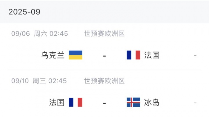 法国国家队将在9月的世欧预中对阵乌克兰和冰岛,小组第一名将直接晋级2026年世界杯。